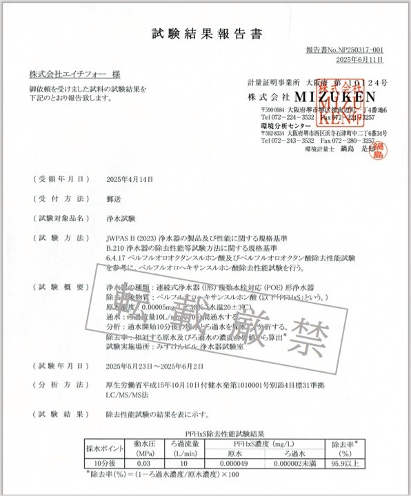 第三者機関にて検査した結果、PFHxS除去率95.9%以上であることが証明されました。